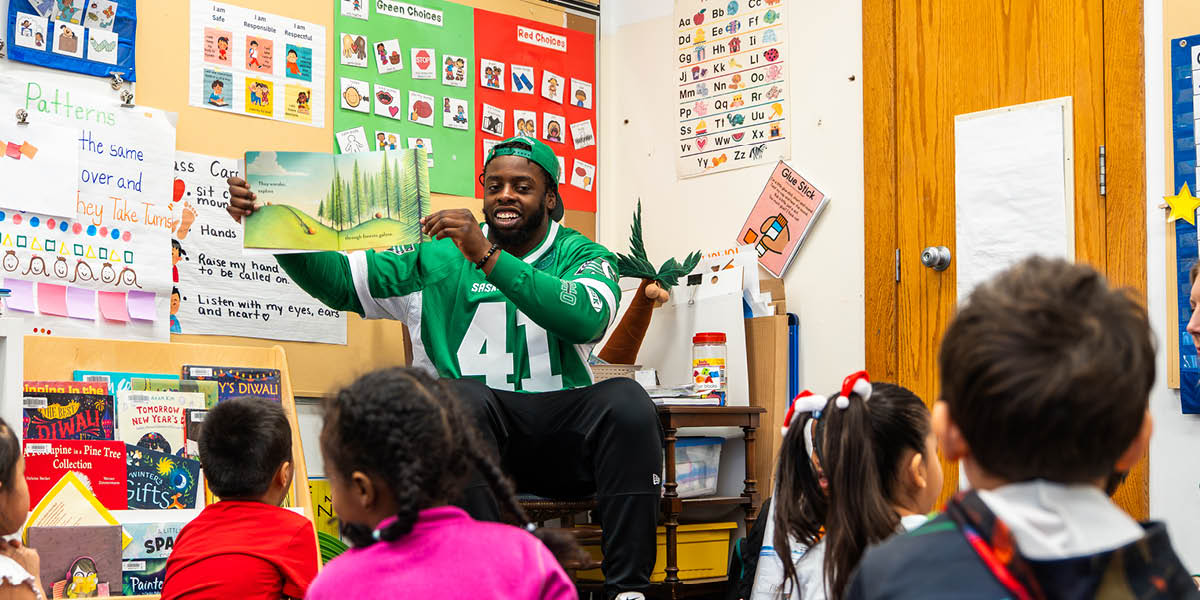 PROCEEDS The Rider Reading Program brings the thrill of game day to the world of books, encouraging students to dive into reading while getting a unique opportunity to meet a Roughrider player!